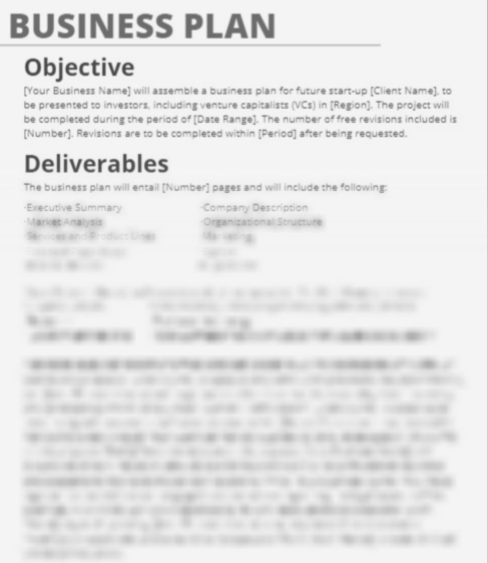 Designed for content strategists, marketers, and business professionals whose clients may require a business plan. This proposal will clarify the scope of work, details of the future business plan, timeline, and payment terms. It precedes a legal agreement or contract, allowing the prospect to review all project details before committing to it.